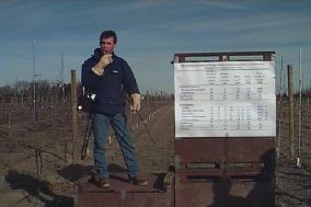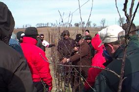 | At long-time IDFTA supporter and past-president Harold Schooley's Orchard in Windham Centre, the group gets into the finer aspects of training and pruning a young super slender-spindle block planted at two feet beetween trees. Schooley's goal is to replant 4-6% of his acreage annually, i.e. turning orchard over every 16-25 years. He is also pioneering the use of GPS (Global Positioning System) technology to map his young orchards. He is collecting soil and leaf/fruit samples at GPS identified sites within his young orchards, with his aim to fine tune the nutritional status status of blocks to increase yields. | ![]() |