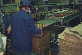 The packing line at the Norfolk Fruit Growers' Association is state-of-the-art, using video cameras to sort fruit by size and color, and computerized automatic and semi-automatic bagging units. The 32 member co-op was chartered in 1906, and reperesents 2,800 acres of orchard with the potential to produce over two million bushels of apples (15-20% of Ontario production). They can C.A. store almost one million bushels of fruit. |
