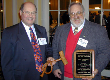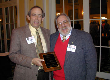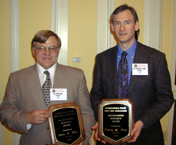 Although not specifically a Researhcer or Grower Award, nonetheless Gary Mount (l.) receives a plaque from President Steve Blizzard (r.) congratulating him on his long-time service to IDFTA as a Board Member. Mount, who runs Terhune Orchards in Princeton New Jersey with his wife Pam, served on the Board of Directors for twelve years. |