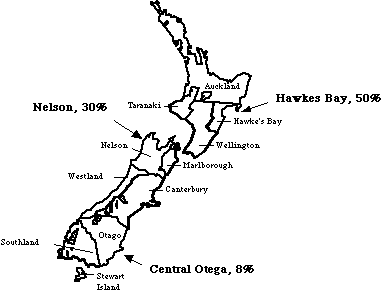 The fruit-growing regions Hawkes Bay, Nelson and Central Otago extend over a range in latitude of approximately 7û (39û to 46û) or approximately 900 km (559 miles). Differences in latitude as well as eastern and western coastal influences give rise to significant differences in environmental conditions in each region. Hawkes Bay has a relatively long and warm growing season. Nelson is a little cooler than Hawkes Bay and tends to have higher rainfall, especially in spring. Central Otago is the least maritime and most continental climate of New Zealand's fruit-growing regions with shorter, hot summers, cold winters and little summer rainfall (Table 2). Some of these influences may help us explain sources of variability in fruit appearance and quality.