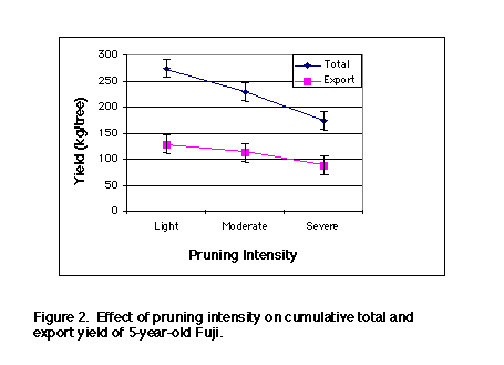 Higher total yields produced by lighter pruned trees did not cause a commensurate increase in the production of export quality (first grade) fruit. Although lighter pruning increased yield, many fruit from these young trees lacked sufficient color (Figure 2).