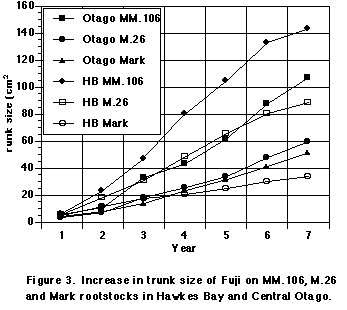 Tree size differs among rootstocks and these differences are characteristic for particular geographic regions. In Central Otago (cooler region), the difference in tree size (estimated using trunk size) between Mark and M.26 is not great, whereas in Hawkes Bay (warmer region) trees on Mark are considerably smaller than on M.26 (Figure 3). Rootstock influence on fruit quality is defined by a trend for more high quality fruit from trees on rootstocks with increasing dwarfing effect. Average export packouts over years 4-7 was higher in trees on M.26 and Mark than MM.106 in both regions (Table 3). Cumulative export yield was generally better from trees grown on more dwarfing rootstocks.