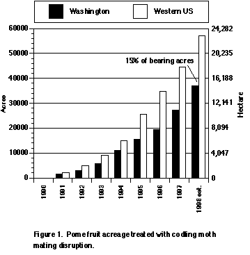 Mating disruption technology for codling moth control was first registered by the EPA in 1991 and was used on no more than 2000 acres (809 ha) that year in North America. The acreage increased to an estimated 45,000 acres (18,212 ha) in 1997, almost entirely located in Washington, Oregon and California. Its use has increased most dramatically in Washington, with about 15,000 acres (6,071 ha) treated in 1995 and close to 27,000 acres (10,927 ha) in 1997 (about 15% of the Washington bearing acreage of pome fruits). We can expect to have more than 35,000 acres (14,165 ha) treated in 1998 in our state (Figure 1). What factors have led to the rapidly increasing use in Washington, and why is so much of the use concentrated in our state?