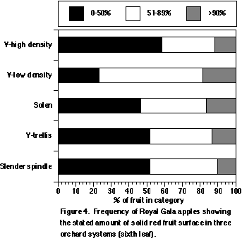 5. Although not always consistent, fruit color and size tended to be poorer at very high densities. Inconsistencies may be caused by year-to-year effects of pruning, training and branch spreading. More time will be required to determine the persistence of these trends in fruit quality. We plan to continue monitoring the planting to determine whether the system differences seen in 1997 will be consistent, change or disappear in coming years, especially the effects on yield, light interception and fruit quality. Training system, rectangularity and density effects may become more important over time. The findings reported here echo the principles that Robinson et al. (1996) presented at a recent IDFTA conference. The similarity between results in such different geographic and climatic situations re-affirms the soundness and general applicability of those principles.