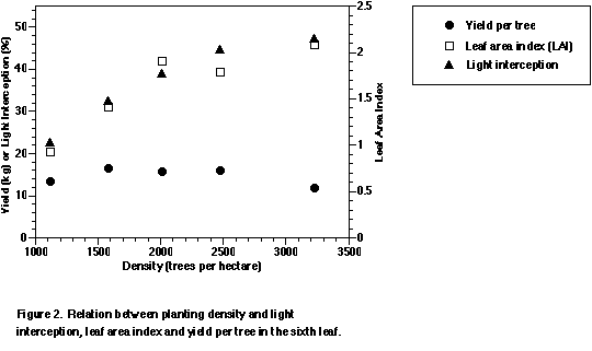 Figure 2. Relation between planting density and light interception, leaf area index and yield per tree in the sixth leaf.