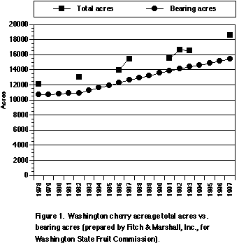 Recent acreage census numbers indicate that, while the acreage and production is increasing, it is a gradual increase. Acreage has risen from approximately 16,000 acres (6,475 ha) in 1987 to about 19,000 acres (7,689 ha) in 1997. Nursery sales indicate that in the last 2 years enough cherry trees to plant over 1,500 acres have been sold. But this figure is misleading in that a large portion of those trees were purchased to replace trees killed in the 1996 freeze. These sales also include some out-of-state customers. These 19,000 acres (7,689 ha) produced 90,081 tons (81,721 metric tons) in 1997, up from the freeze reduced crop of 62,155 in 1996.