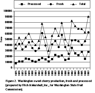 Future trends for the industry will focus on three main areas: new rootstocks and varieties, labor efficiencies and marketing. New dwarfing rootstocks are seen as very desirable, not only because of their precocity but also for management efficiency. This will continue to be a major trend in the industry. New varieties are expanding the marketing window and opening niche markets as with field-packed Rainier cherries. More effort will be given to reduce labor costs, i.e., smaller trees, picking directly into bins and mechanizing harvest. Modified atmosphere packing is now being employed by several warehouses and, as that technology is perfected, will aid in spreading out our market window and getting cherries to market in better conditions. Consumer friendly packaging such as bagged fruit and clam shells are changing our marketing efforts.