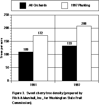 The density at which cherry trees are planted in Washington is also increasing. In the early 1970s we were generally planting on a 20 ft x 20 ft (6 x 6 m) spacing at about 109 trees per acre (269 trees/ha). Growers are planting trees today at about 203 trees per acre (500 trees/ha). To do this there has been a change in the training system to a more upright conical-shaped tree. Dwarfing rootstocks have also begun to make an impact on density which will increase as smaller trees become more available. Of the estimated 350,000 cherry trees sold from Washington nurseries, 60% will be on Mazzard; 15% on Mahaleb; 10% on Colt; 7% on Gisela 5; 4% on Gisia 6 and 4% on a range of other rootstocks. Most dwarfing rootstocks are sold out for 1998 and 1999.