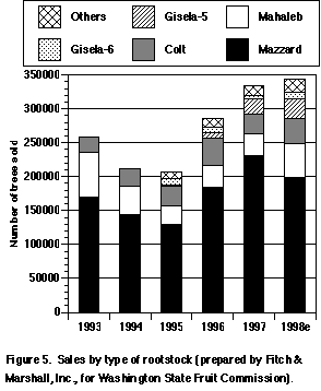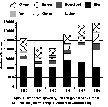 Bing still is the number one cherry variety being planted. Bing makes up 31% of the nursery stock sold for 1998. Lapins is a close number two, with 29%. Chelan and Sweetheart each comprise about 9% of the tree sales and Rainier has dropped to about 4% of tree sales.