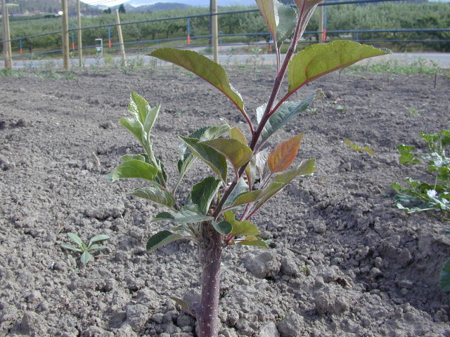 The variety bud has started growing on the left. The rest of the shoot growth is the rootstock, which we suspect is B.9, based on the characteristic reddish leaf color.